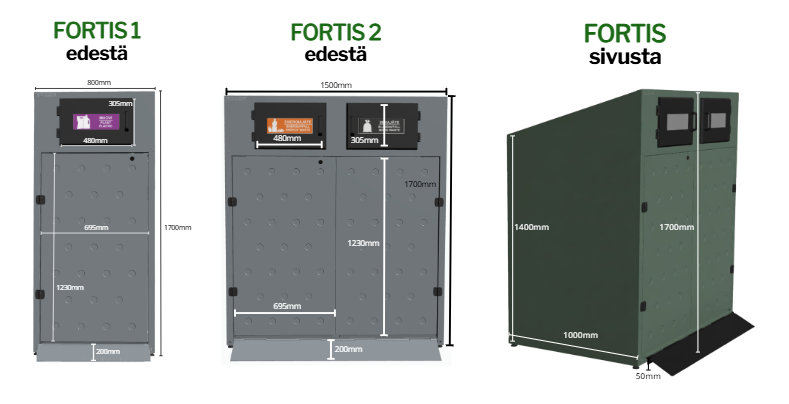 Fortis 1 ja 2 ovat uuden sukupolven palonkestäviä jäteastiasuojia, jotka on suunniteltu estämään palon leviämistä kohteissa, joissa turvallisuus on ensiarvoisen tärkeää. Mallit ovat jämäköitä ja tyylikkäitä, ja niiden pelkistetty muotoilu sulautuu vaivattomasti kaikenlaisiin ympäristöihin. Suojakaapit voidaan tilata kaikissa RAL-väreissä ja/tai personoida laminoimalla pinnat. .
