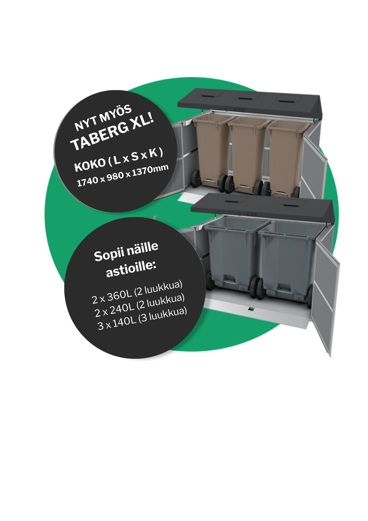 Paremman ilmanvaihdon varmistamiseksi yläosa on koristeellisesti rei’itetty. Jäteastiasuojassa on mekaaninen lukko, jota käytetään jäteastiaa/-astioita tyhjennettäessä. Taberg-jäteastiasuojaa on saatavana 140 tai 240 litran jäteastioille. Taberg-jäteastiasuoja 140 tai 240 -litraisille jäteastioille on varustettu säätölevyllä, jotta jäteastia voidaan kiinnittää oikein. Tämä jäteastiasuoja soveltuu parhaiten lasi-, metalli- ja biojätteille.