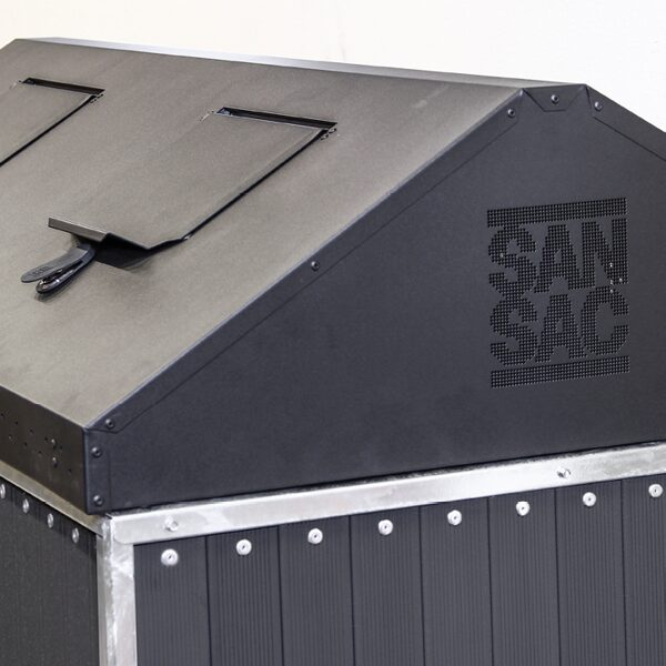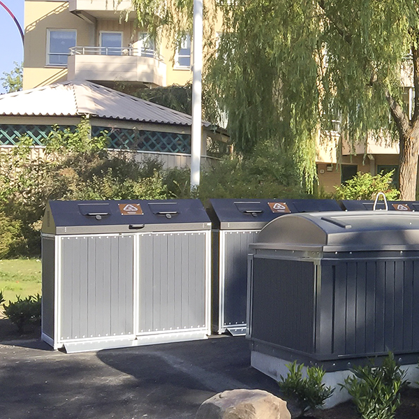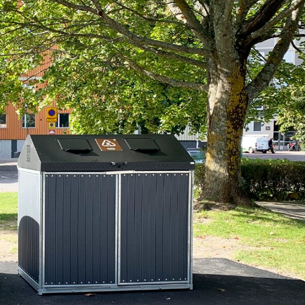 Taberg-jäteastiasuoja on tyylikäs klassikko ja kaikessa yksinkertaisuudessaan toimiva ratkaisu. Se koostuu vakaasta, teräsrakenteisesta rungosta, paneeleista ja mustaksi lakatusta kannesta, jossa on kaksi luukkua.